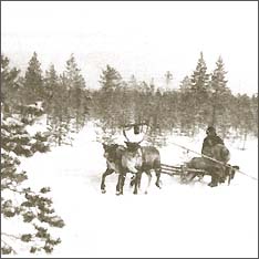 У северных коми основным ездовым животным является олень, запряженный в нарты.
