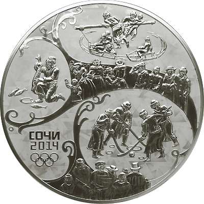 - На лицевой стороне трехрублевых серебряных монет Сочи 2014 отчеканен рельефный герб Российской Федерации, над гербом