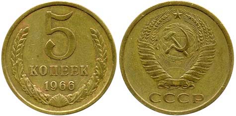 Монета 5 копеек 1966 года. Цена 1100 рублей
